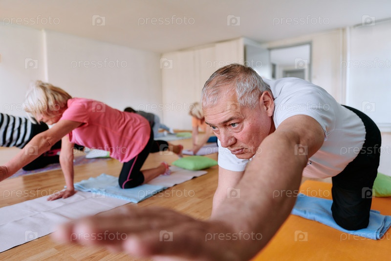 Пожилой мужчина выполняет упражнения для шеи и спины, способствующие здоровому старению и благополучию