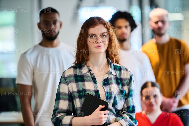 Группа молодых бизнесменов разного пола идет по коридору в застекленном офисе современного стартапа, среди них — человек в инвалидной коляске и женщина в хиджабе