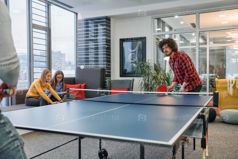 Коллеги по бизнесу отдыхают от работы, чтобы поиграть в настольный теннис, способствуя командной работе и товариществу на рабочем месте