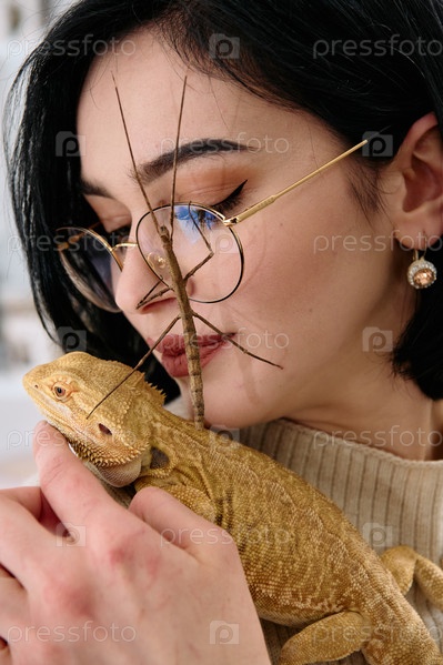 Женщина и ее питомцы: бородатая агама и палочник
