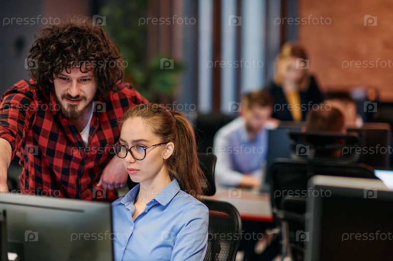 Коллеги по бизнесу, мужчина и женщина, обсуждают бизнес-стратегии, внимательно глядя на монитор компьютера, олицетворяя сотрудничество и инновации