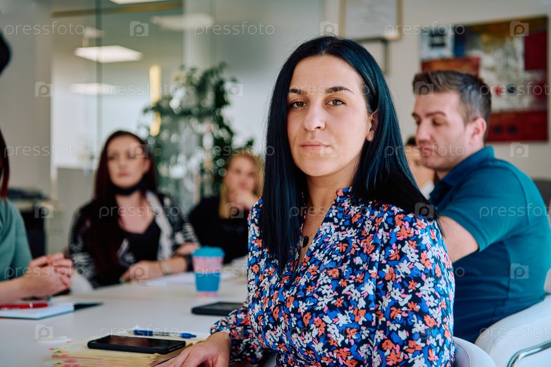 Разнообразная бизнес-группа обсуждает проекты в современном стеклянном офисе
