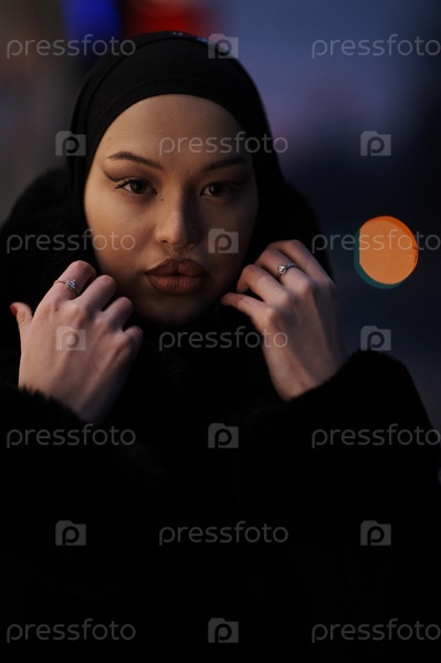 Мусульманка идет по городской улице холодной зимней ночью в хиджабе