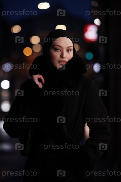 Мусульманка идет по городской улице холодной зимней ночью в хиджабе