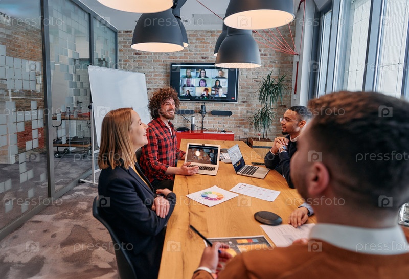 В яркой атмосфере современного офиса стартапа разнообразная команда профессионалов в сфере бизнеса участвует в обсуждениях различных проектов и разрабатывает новые бизнес-стратегии, олицетворяя креативность и инновации в предпринимательской среде