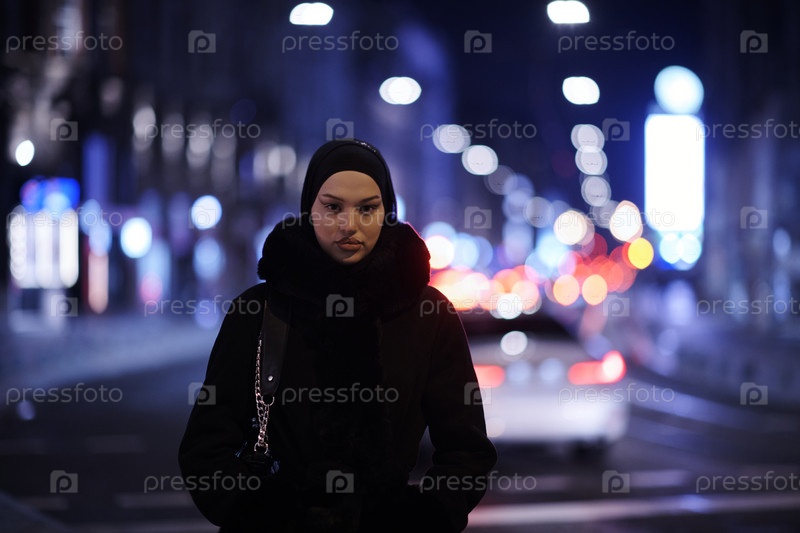 Мусульманка идет по городской улице холодной зимней ночью в хиджабе