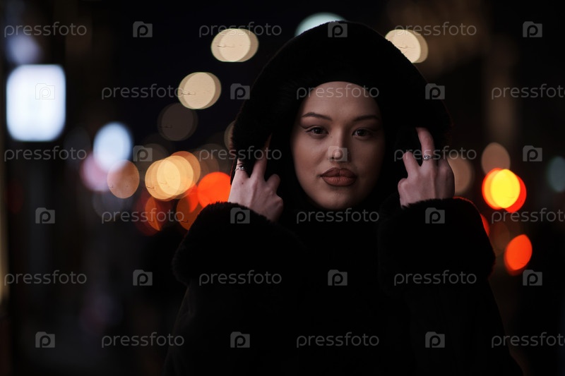 Мусульманка идет по городской улице холодной зимней ночью в хиджабе
