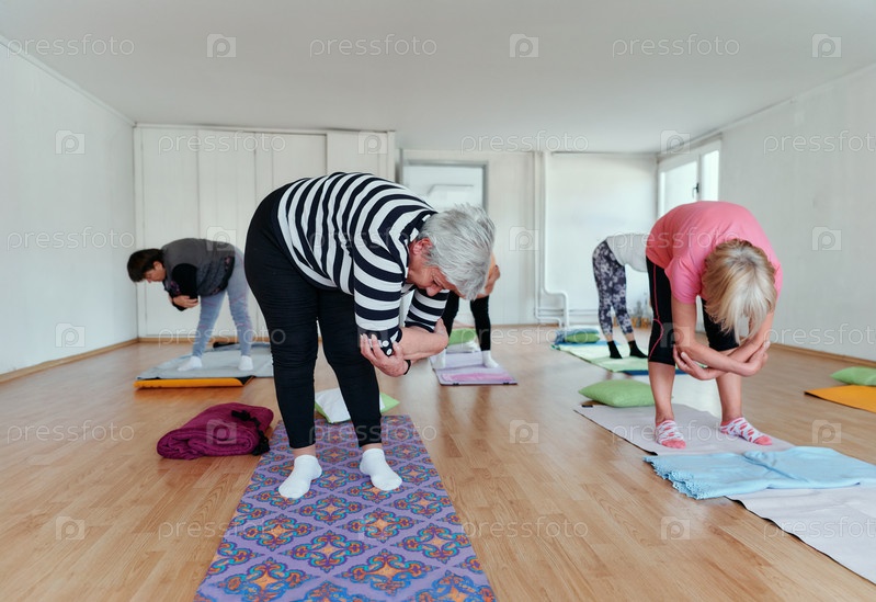 Женщины старшего возраста занимаются оздоровлением: йогой и растяжкой в залитом солнцем пространстве