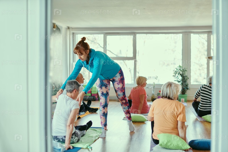 Женщины старшего возраста занимаются оздоровлением: йогой и растяжкой в залитом солнцем пространстве
