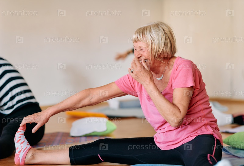 Женщины старшего возраста занимаются оздоровлением: йогой и растяжкой в залитом солнцем пространстве