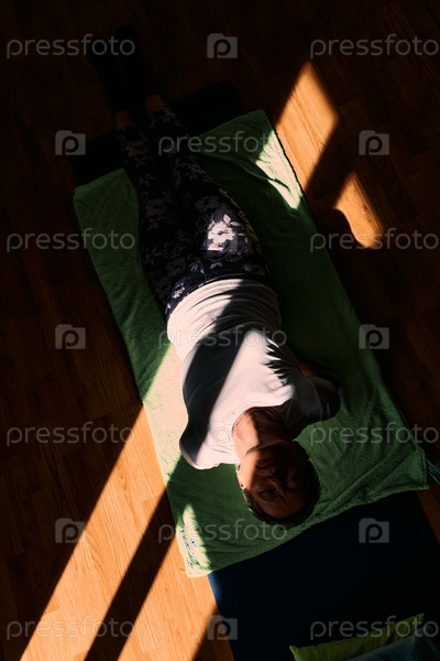 Пожилая женщина практикует растяжку и медитацию на полу, уделяя особое внимание правильному выравниванию и расслаблению