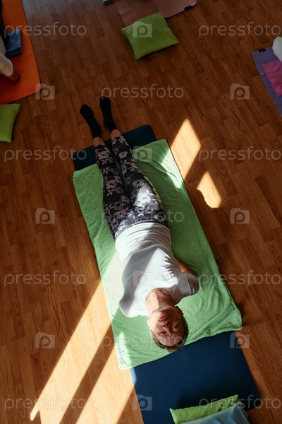 Пожилая женщина практикует растяжку и медитацию на полу, уделяя особое внимание правильному выравниванию и расслаблению