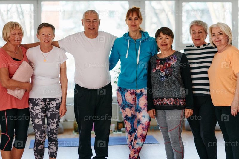 Группа пожилых людей и один мужчина с удовольствием позируют со своим инструктором по йоге после успешной тренировки