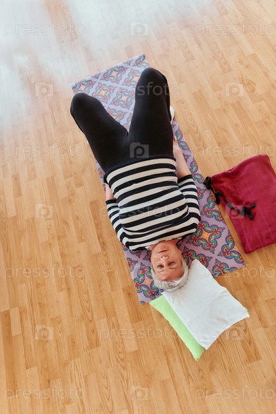 Пожилая женщина практикует растяжку и медитацию на полу, уделяя особое внимание правильному выравниванию и расслаблению