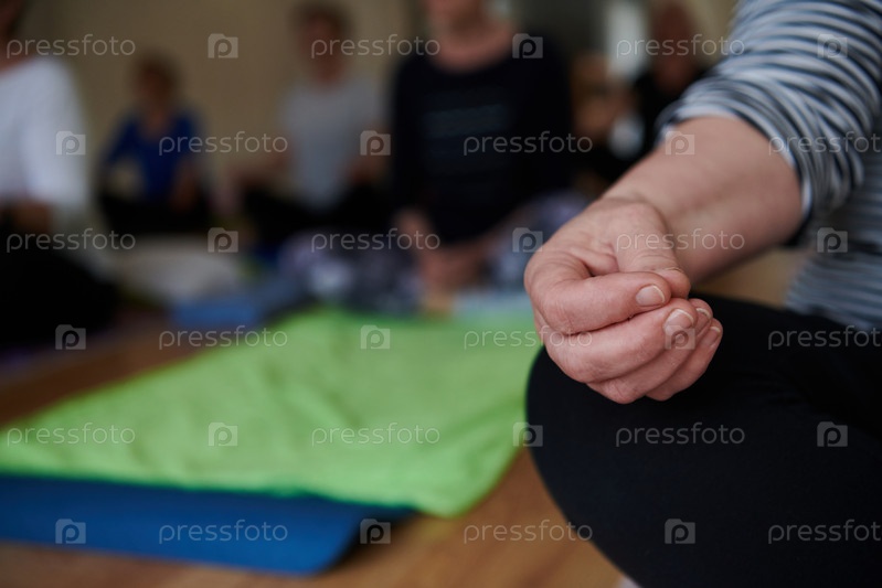 В этом залитом солнцем пространстве рука пожилой женщины грациозно выполняет различные позы йоги, олицетворяя суть активного старения, здоровья и внутреннего покоя