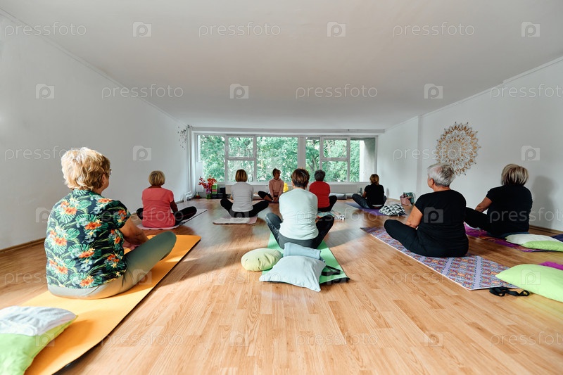 Группа пожилых женщин занимается различными упражнениями йоги, включая растяжку шеи, спины и ног, под руководством тренера в залитом солнцем месте, способствуя благополучию и гармонии