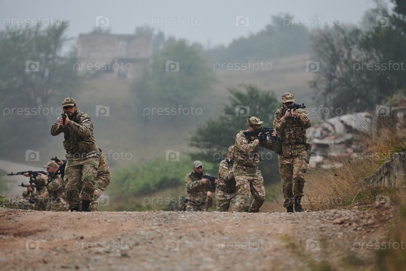 Дисциплинированное и специализированное военное подразделение, облаченное в камуфляж, осуществляющее стратегическое патрулирование и сохраняющее контроль в обстановке с высокими ставками, демонстрирующее свою точность, сплоченность и готовность к специаль