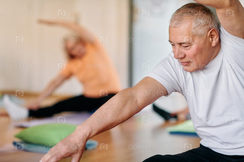 Пожилой мужчина выполняет упражнения для шеи и спины, способствующие здоровому старению и благополучию
