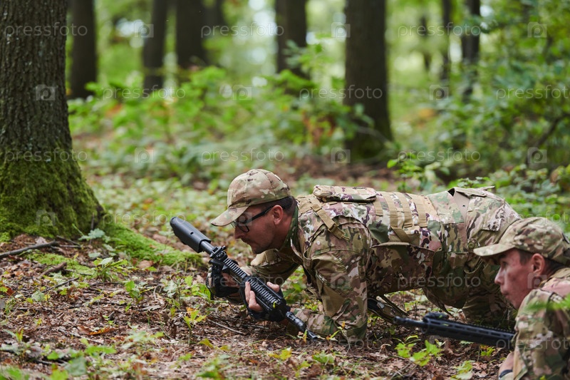 Элитные солдаты скрытно маневрируют через густой лес, замаскированные в специализированное снаряжение, отправляясь на секретную и стратегическую военную миссию