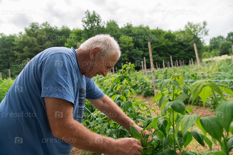 Пожилой фермер собирает свежую спелую малину в залитом солнцем саду