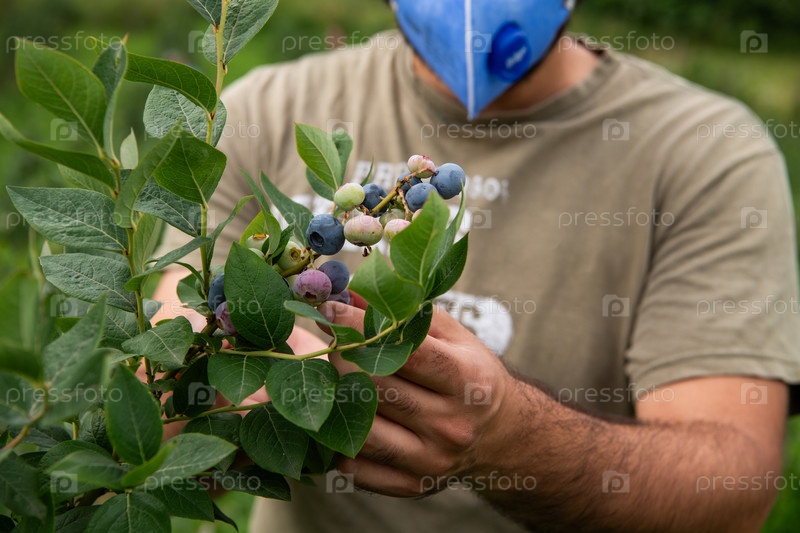 Фермер в защитной маске проверяет качество черники и наличие вредителей на своей небольшой ферме