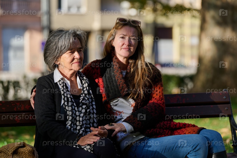 Обнимая поколения: любовь и поддержка дочери для ее пожилой матери в солнечный день в парке