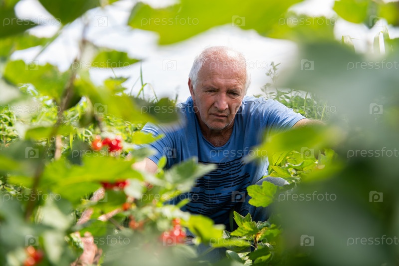 Старший фермер тщательно осматривает свою черничную ферму, чтобы убедиться в качестве и прогрессе