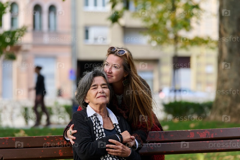 Обнимая поколения: любовь и поддержка дочери для ее пожилой матери в солнечный день в парке