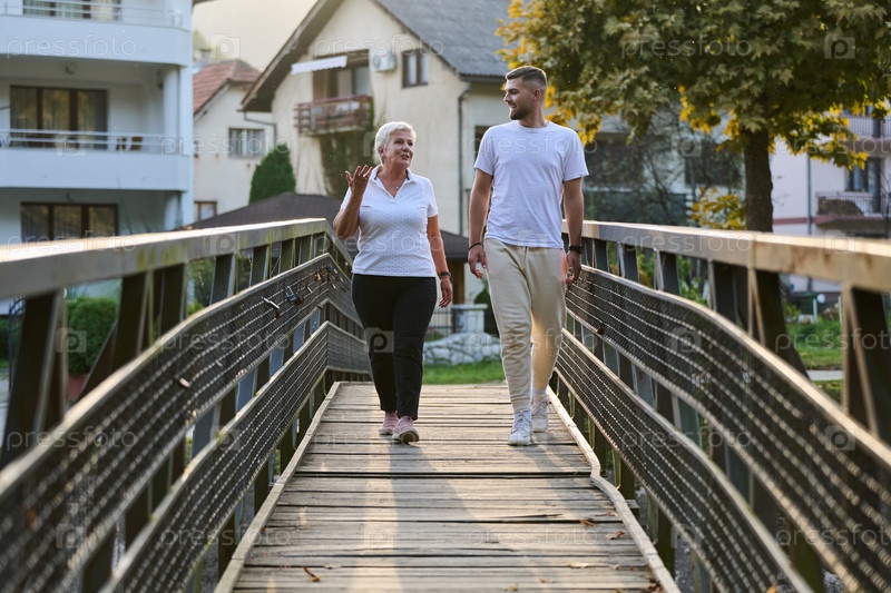 Красивый мужчина и пожилая женщина спокойно прогуливаются на природе, пересекая красивый мост на фоне потрясающего заката, олицетворяя концепцию здоровой и яркой жизни между поколениями