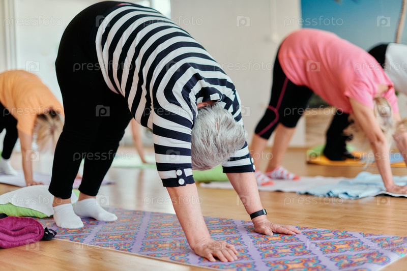 Женщины старшего возраста занимаются оздоровлением: йогой и растяжкой в залитом солнцем пространстве