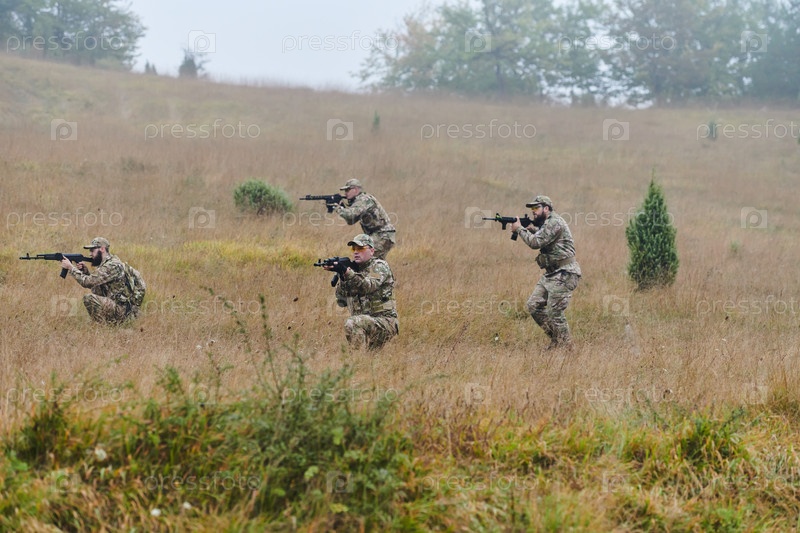 Дисциплинированное и специализированное военное подразделение, облаченное в камуфляж, осуществляющее стратегическое патрулирование и сохраняющее контроль в обстановке с высокими ставками, демонстрирующее свою точность, сплоченность и готовность к специаль