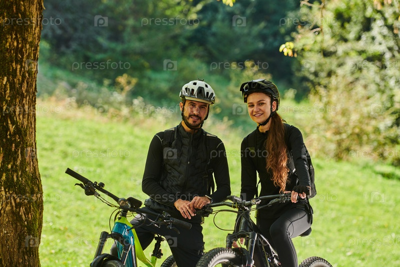Счастливая пара, одетая в профессиональную велосипедную экипировку, наслаждается романтической велопрогулкой по парку, окруженному современными природными достопримечательностями, излучая любовь и счастье