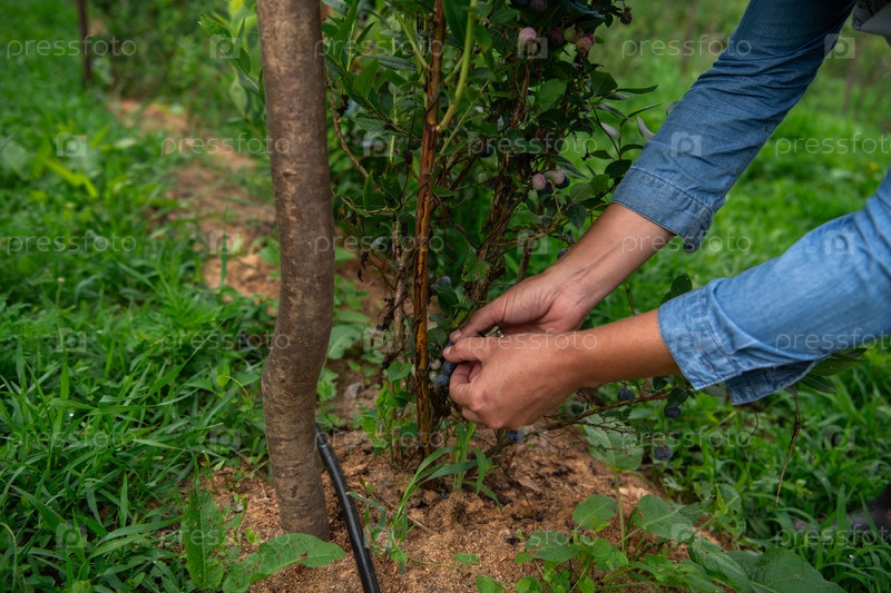Крупный план женской руки, осторожно собирающей свежую чернику в залитом солнцем саду