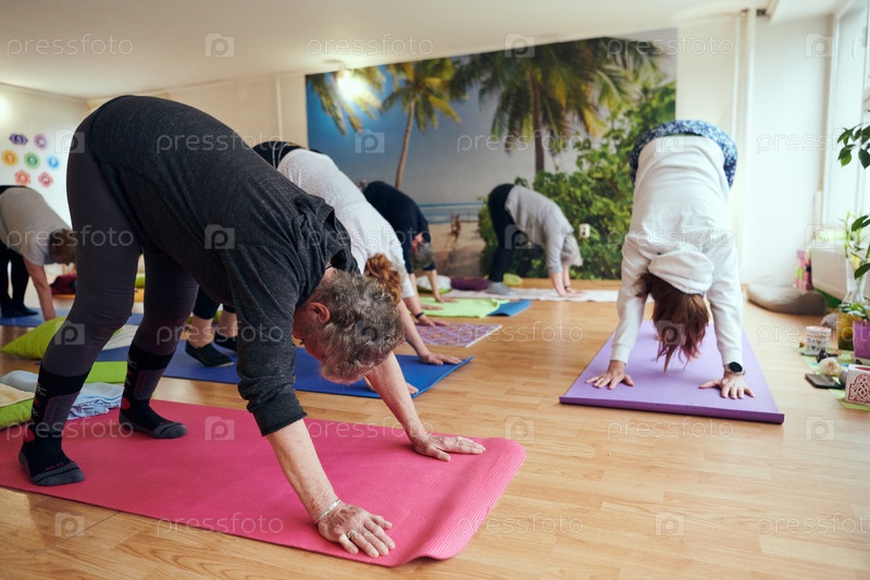Группа пожилых женщин занимается различными упражнениями йоги, включая растяжку шеи, спины и ног, под руководством тренера в залитом солнцем месте, способствуя благополучию и гармонии