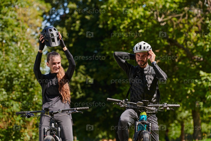 Счастливая пара, одетая в профессиональную велосипедную экипировку, наслаждается романтической велопрогулкой по парку, окруженному современными природными достопримечательностями, излучая любовь и счастье
