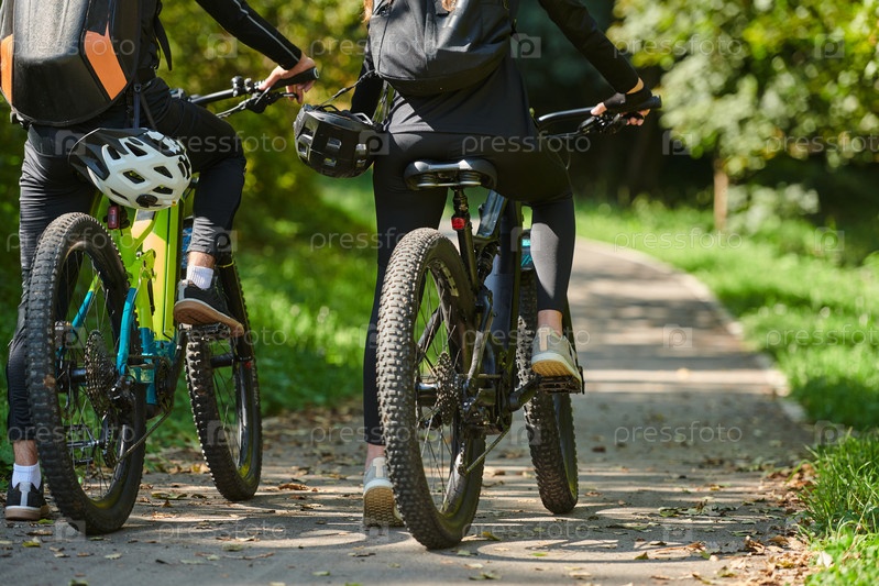 Счастливая пара, одетая в профессиональную велосипедную экипировку, наслаждается романтической велопрогулкой по парку, окруженному современными природными достопримечательностями, излучая любовь и счастье