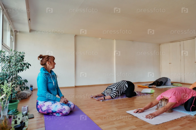 Женщины старшего возраста занимаются оздоровлением: йогой и растяжкой в залитом солнцем пространстве