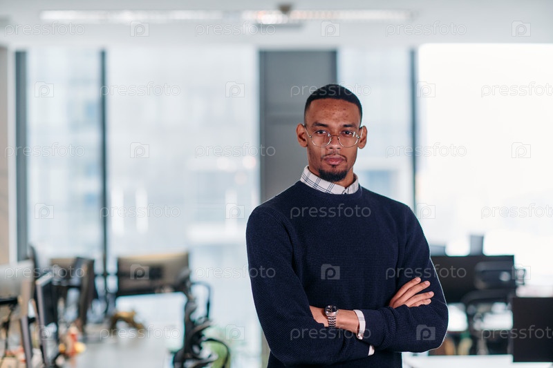 Уверенный афроамериканский бизнесмен позирует в современном офисе стартапа