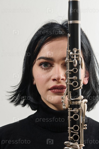 Изящная брюнетка-музыкант позирует с кларнетом на белом фоне