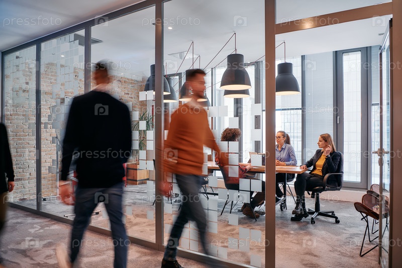 В динамичной суете деловой среды группа молодых специалистов идет по коридору рядом со своим офисом, в то время как их коллеги сотрудничают внутри, что символизирует командную работу и производительность