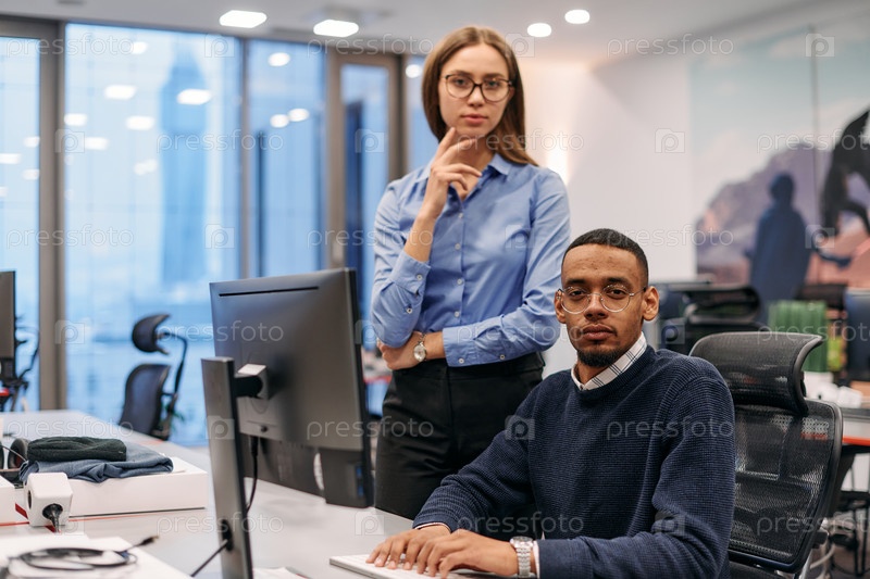 Цифровое сотрудничество: светловолосая бизнес-леди и ее партнер-афроамериканец просматривают документы онлайн