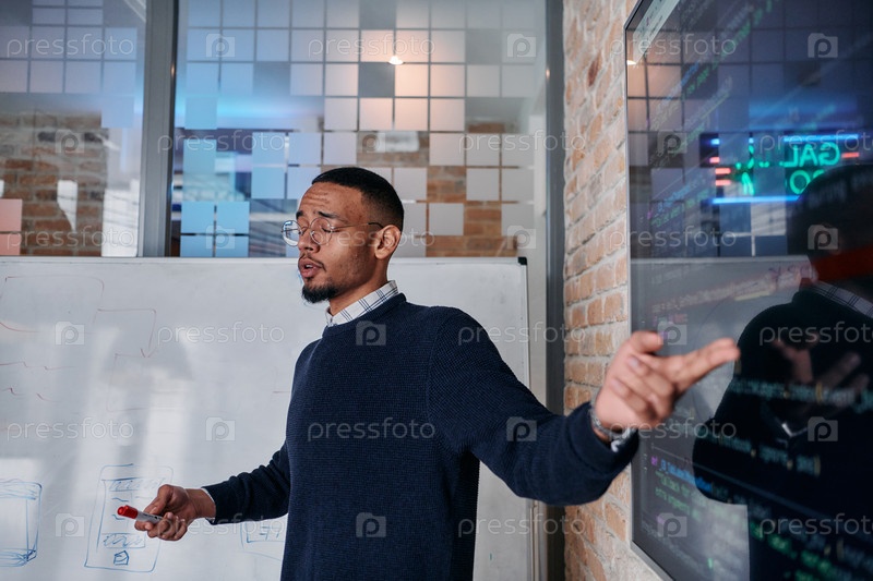 Афроамериканский бизнесмен проводит убедительную презентацию своей бизнес-стратегии для коллег, способствуя сотрудничеству и дальновидному мышлению