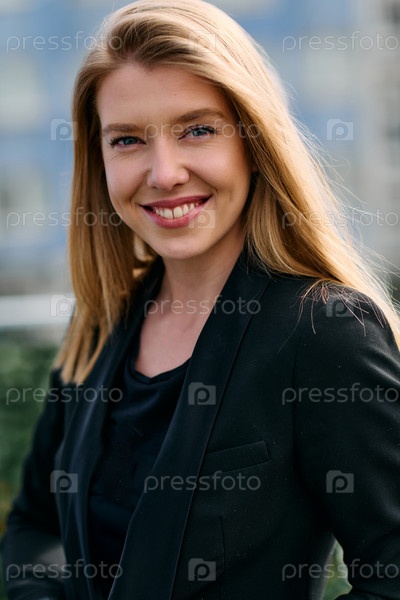 Портрет стильной деловой блондинки, позирующей на террасе в городском пейзаже