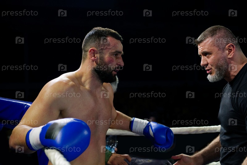 Загнанный в угол боксер получает стратегические советы от тренера во время напряженного боя