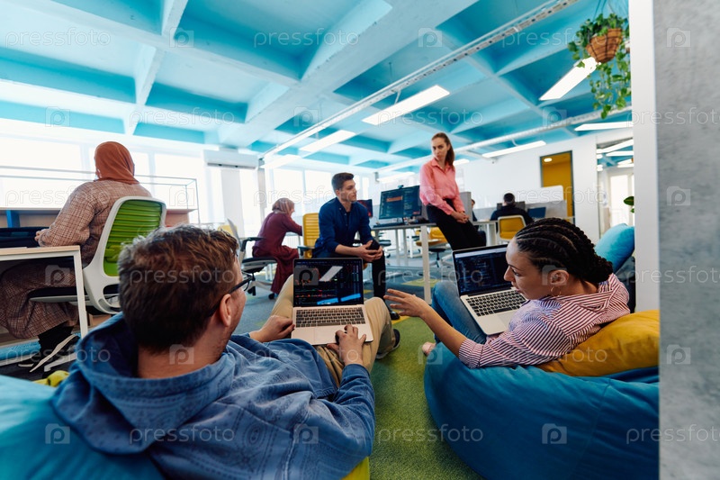 В современном офисе стартапа разнообразная группа молодых и способных бизнесменов ведет оживленные обсуждения различных проектов, демонстрируя командную работу, инновации и предпринимательский дух