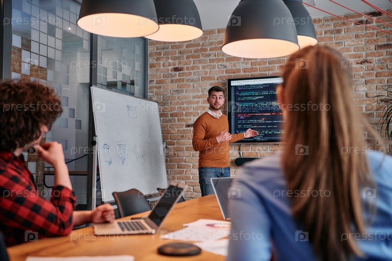 В корпоративной обстановке бизнесмен проводит совещание, страстно представляя бизнес-план своей внимательной команде, способствуя сотрудничеству и стратегическому мышлению