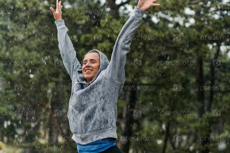 Красивая женщина наслаждается дождливым днем после интенсивной пробежки