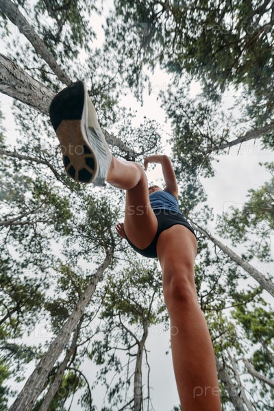Авантюрная женщина преодолевает лесные препятствия с решимостью и ловкостью