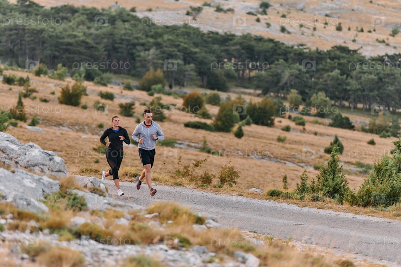 Пара в спортивной одежде бежит по живописной дороге во время утренней тренировки, наслаждаясь свежим воздухом и поддерживая здоровый образ жизни