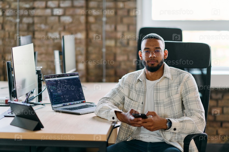 Афроамериканский предприниматель отдыхает в современном офисе, просматривая социальные сети с помощью смартфона, наслаждаясь моментом цифрового общения и отдыха среди своих деловых начинаний